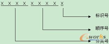 編碼碼長9位,分為三部分:第一部分4位,分類號,第二部分4位,順序號,第三部分1位,標識號。基本采用全數字(0-9)編碼。用圖簡示如下: