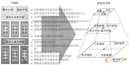 國內外一些大的咨詢機構和業內專家普遍認為,一個有效的、能夠指導企業開展信息化建設的IT規劃主要由以下三方面的宏觀要素構成: