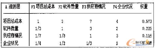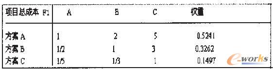 通過對企業相關人士的調查,對于所選定的備選項目的評價指標,根據上述內容可以分析出各評價指標的重要程度,兩兩比較得到的判斷矩陣(表)如表1所示。