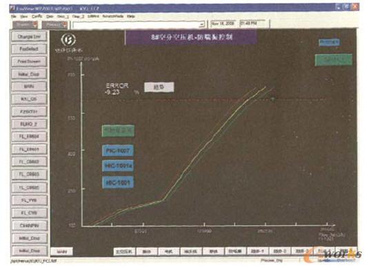 此外,在DCS監控面面上實現了壓縮機組運行點的動態指示,如圖2所示。使操作人員對機組運行位置以及與控制線、喘振線的距離都能一目了然,便于操作人員必要時盡可能快地干預設備運行狀態,減少了故障的發生。