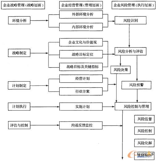 在日常經營管理活動中,企業無法完全規避所面臨的風險,但可以借助有效管理將風險控制在最小范圍中。企業風險管理是通過風險識別、風險分析與評估、風險決策、風險預警和風險管理等方面所組成的體系,是依照企業戰略管理過程設計,配合經營管理過程而發揮作用的,它由戰略層面、管理層面和執行層面結合形成有機系統,共同發揮作用。企業風險管理與企業戰略管理與經營管理的關系見圖1。