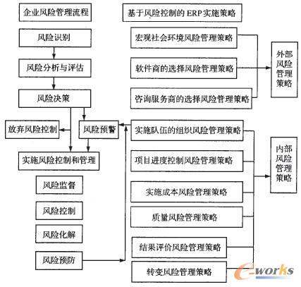 企業風險管理同戰略管理和經營管理緊密相連,形成企業管理體系中的組成部分,為保證戰略目標的實現和經營管理活動的開展,發揮風險控制和防范的作用。企業風險管理的建立為ERP的成功實施提供保障。ERP實施策略的選擇應當建立在企業風險管理的基礎之上,將ERP管理與風險規避實現有機結合。見圖2所示。
