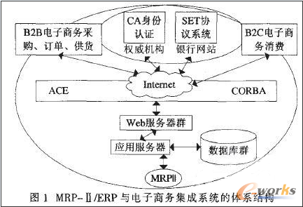 圖1中概括了MRP/ERP與電子商務(wù)集成系統(tǒng)的各主要企業(yè)生產(chǎn)和商務(wù)邏輯處理部件:MRP/ERP系統(tǒng)、電子商務(wù)系統(tǒng)、安全認(rèn)證系統(tǒng)等。