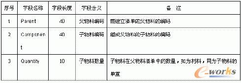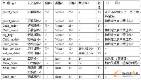 產品結構數據(制造BOM,即產品結構):父項代碼、子項代碼 、消耗定額 、損失系數、有效日期、替換件標識、工程改變號等;