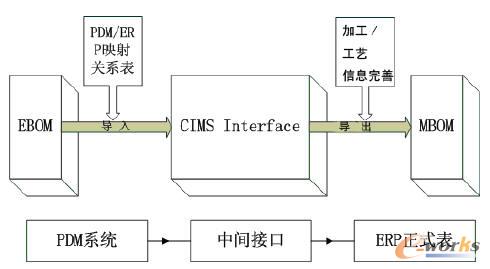 運用ERP中CIMS Interface(集成制造接口子系統)來完成集成。即先從PDM中把數據導入到一個臨時環境中,然后再在這個臨時環境中對數據處理,最后再導入到正式的ERP環境中。