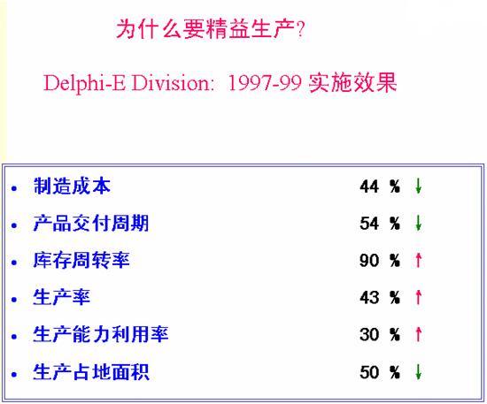 為什么要做精益生產呢?下面是Delphi-E Division在97年-99年進行精益生產后的收益。在座的企業人士肯定會非常的心動。