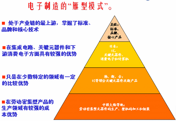 作為電子企業,雁型的模式發展的更好,像是歐洲式的企業,它是處于產業鏈的上端,它是處在這個產業的上端。它在一些關鍵的集成電路等等方面也占了非常領先的地位。我們在亞洲其他的一些國家,它只是在少數的領域有特點,比如在臺灣在器件方面是有優勢的。從我們國家目前來來看,還是體現在勞動緊密型方面具有優勢。所以目前我們的重點還是在這些勞動密集型方面有優勢。