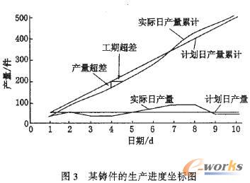 鑄造企業的產品規格較為穩定,工序專門化程度高,產量隨時間變化。因此,本系統采用坐標圖閉來描述實際生產數和計劃產量數的進度,比較實際生產進度與計劃進度的差異,程序自動生成各生產時段的計劃實際對照表(如表),然后根據此表繪出生產進度坐標圖(如圖3),通過人機交互控制生產作業的進程。