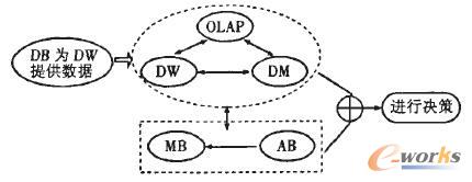 (1)DW:實(shí)現(xiàn)對(duì)決策主題數(shù)據(jù)的存儲(chǔ)和綜合,為DSS提供數(shù)據(jù)存儲(chǔ)和組織的集成。對(duì)底層數(shù)據(jù)庫中的數(shù)據(jù)進(jìn)行集成、轉(zhuǎn)換、綜合,組織成面向全局的數(shù)據(jù)視圖。