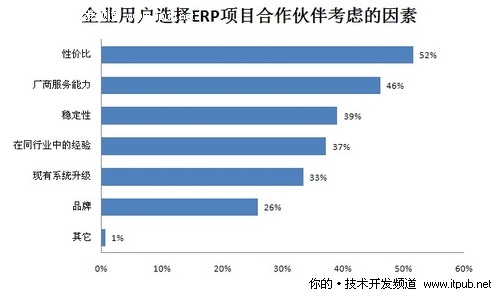 根據調查,企業在ERP項目建設過程中,選擇合作伙伴時主要考慮合作伙伴產品的性價比(52%)和廠商的服務能力(46%),其次是產品穩定性(39%)和在同行業中的經驗(37%),以及現有系統升級(33%)和品牌(26%)。