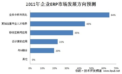 在本次調查的最后,我們給出了一個2011年ERP市場發展展望的調查,是希望能為大家前瞻未來的發展方向做參考。在我們給出的業務分析與優化、更加注重專業人才培養、移動互聯網應用、云計算和BI中,業務分析與優化排到了第一名,在參于調查的400多位IT人員中,有64%的人選擇此項。其他為更加注重專業人才培養(45%)、移動互聯網應用(35%)、云計算(22%)和與BI融合(20%)。