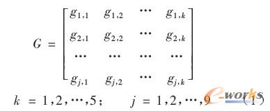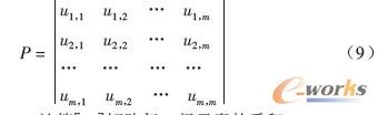 設選擇的評估指標變量用uj,i來表示uj相對于ui的相對重要性(此處i,j均表示指標變量,m表示變量個數,即m=9),可通過同行專家評議確定。根據評議結果,可得判斷矩陣[P]如下: