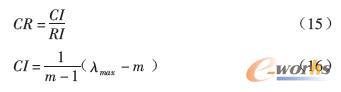 根據式(12)求出的最大特征根所對應的特征向量{wj}反映了評估指標因素重要性的排序,但作為指標相關權,其權數分配是否合理,需要對判斷矩陣進行一致性檢驗,計算其隨機一致性比率CR來進行判斷。