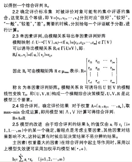 由于評估指標有層次性,每一個評價指標占有不同的份量,一般情況下要采用層次分析的方法將指標體系分成遞階層次結構。但是并非各個指標都可以定量分析的,即使可以定量,也難以具體給出精確的數值評判,所以評價具有模糊性,模糊綜合評判決策就是對受多種因素影響的事物作出全面評價的一種十分有效的多因素決策方法,該方法又稱為模糊綜合決策或模糊多元決策。本文選用一種結合模糊綜合決策和層次分析法結合起來的方法進行評估,即用層次分析法確定權重,然后分層次進行模糊綜合評判,并且對評語打分,得出指標的評分,最后綜合出總的評價結果。