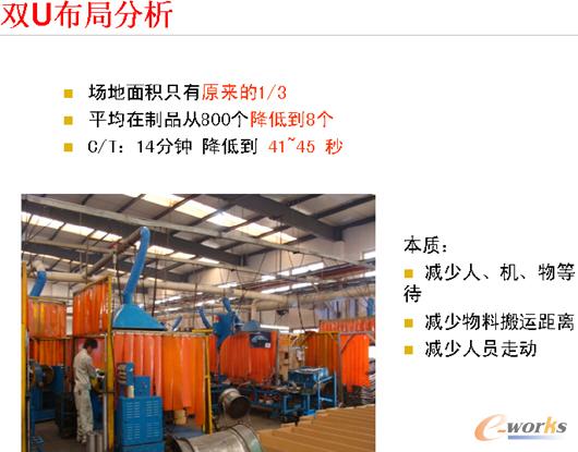 這個功能的作用不是非常的直接,但是,它的實(shí)現(xiàn)是可持續(xù)性的。它在作業(yè)的過程當(dāng)中,分析什么是增值的作業(yè),什么是非增值的作業(yè)。這對于大批量生產(chǎn)轉(zhuǎn)為單件小批量生產(chǎn)的好處非常的明顯。在小批量的生產(chǎn)運(yùn)用中,能讓短期的物流流動起來。"雙U"布局分析讓上海天納克的場地使用只需原來的三分之一,C/T的時間從14分降低到41秒,減少了人員的走動,減少了搬遷的距離。同時持續(xù)流布局節(jié)約了設(shè)備,讓這些設(shè)備可以研究新項(xiàng)目,讓單位產(chǎn)出的效率大大提升。另外,這些效率體現(xiàn)在整體效率上,從2004年-2007年,人均產(chǎn)出提升了3倍。所以,持續(xù)流的布局對企業(yè)而言,用一半的人力,一半的場地,一半的時間創(chuàng)造出同等的價(jià)值。