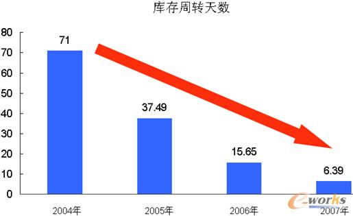 現(xiàn)金轉(zhuǎn)化周期(現(xiàn)金轉(zhuǎn)化周期=庫存周轉(zhuǎn)天數(shù)+應(yīng)收賬款天數(shù)-應(yīng)付賬款天數(shù)),這也是一個非常重要的指標(biāo)。2004年時,這家企業(yè)轉(zhuǎn)化周期是41天,而在經(jīng)過系統(tǒng)應(yīng)用之后,是負(fù)的34天。這意味著企業(yè)盤活了庫存,盤活了資金,盤活了負(fù)債。這是非常良好的狀態(tài),說明企業(yè)的現(xiàn)金流周轉(zhuǎn)非常快。存貨周轉(zhuǎn)由6天下降到了3天,應(yīng)收周轉(zhuǎn)從34天下降到30天,應(yīng)付周轉(zhuǎn)從58天到30天,如果一個企業(yè)的周轉(zhuǎn)是負(fù)的,也就說明企業(yè)的現(xiàn)金流非常大。