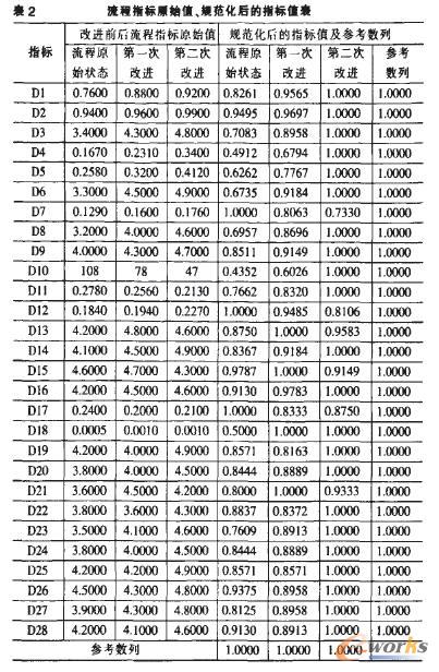計算流程的連續(xù)兩次改進效果的最終關(guān)聯(lián)度時m=3,n=28。比較數(shù)列Vik。由流程連續(xù)兩次改進的指標值構(gòu)成。對改進前后的業(yè)務流程進行時間動作研究.結(jié)合該企業(yè)售后服務部門的統(tǒng)計數(shù)字。可以得出定量指標的指標值。對于定性指標.每個指標的標度采用Uken 5級標度形式.請專家對指標進行打分,根據(jù)打分結(jié)果計算出各項指標得分的平均值。得到流程指標原始數(shù)據(jù),如表2所示。