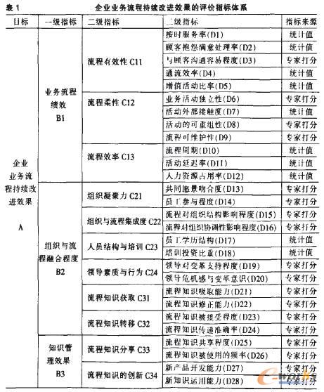 流程持續(xù)改進與業(yè)務流程再造(Business ProcessReengineing,BPR)相比,更關(guān)注流程的持續(xù)發(fā)展?jié)摿。由于業(yè)務流程的持續(xù)改進離不開組織學習與知識管理的支持。它們是流程持續(xù)改進的主要工具與手段。所以,本文所建立的流程持續(xù)改進效果評價指標體系(見表1)不僅包含反映流程績效方面的指標。也包含反映企業(yè)具備的組織學習能力和知識管理能力方面的指標。