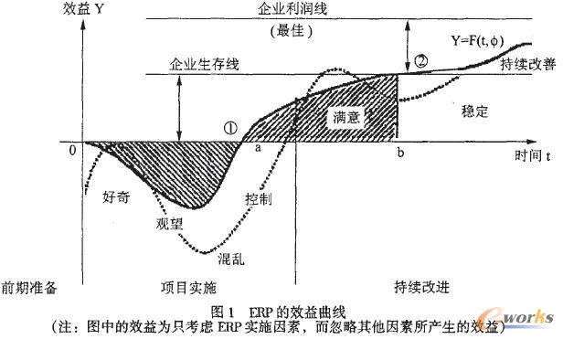 圖中實線代表ERP的效益,虛線代表ERP實施過程中人員的心態變化。①②為實施ERP所獲得的效益。ERP實施過程中由于硬件、軟件費用、咨詢、實施服務費用的增加,企業的收益實際上是減少的。當系統正式開始運行后,這時,一方面系統用戶對系統的認同程度已由原來的不知所措、抵觸逐漸轉為接受甚至滿意;另一方面隨著ERP的基本功能對企業的提升作用,其效益也逐漸體現了出來,效益增加額表現為①部分。②部分的效益,需在企業進行持續的改善的前提下,即動態、循環進行戰略規劃、效益評估與激勵、計劃與控制、創新與持續改進,才能有效獲得。