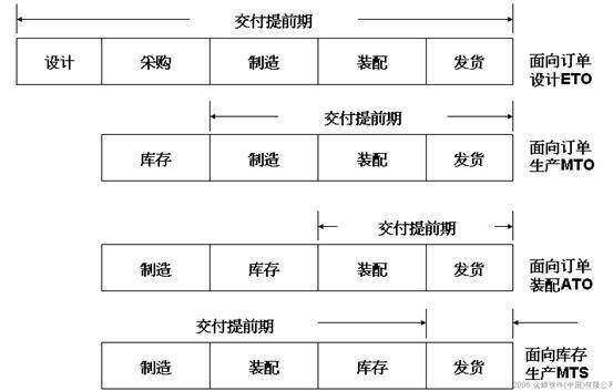 由于生產(chǎn)組織的特點,存在四種不同的制造策略:面向庫存生產(chǎn)、面向訂單裝配、面向訂單生產(chǎn)、面向訂單設(shè)計。其中面向庫存生產(chǎn)的交貨時間最短,但是也最容易產(chǎn)生庫存。