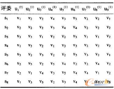企業(yè)內(nèi)部的各階層各部門管理人員,在決定企業(yè)需要用ERP系統(tǒng)來改進(jìn)的因素及其權(quán)重的時(shí)候,被賦予不同的權(quán)重,代表他們對評價(jià)的結(jié)果的分量。也可以請合作單位的有關(guān)人員參與評價(jià),使評價(jià)更加客觀。假定一共有n個(gè)評價(jià)人員,其權(quán)重集為S=(s1,s2,s3,……,sn)。本例中,假設(shè)有8位人員參與評價(jià),它們之間的權(quán)重分配為S=(0.20,0.15,0.15,0.10,0.10,0.10,0.10,0.10)。