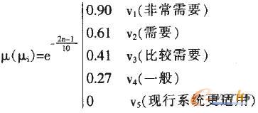 評價(jià)集的取值采用的是等級評分,本例將v1(非常需要),v2(需要),v3(比較需要),v4(一般),分別賦值為n1=1、n2=3、n3=5、n4=7來設(shè)定各等級的隸屬度,v5(現(xiàn)行系統(tǒng)更適用)設(shè)為0,隸屬度通過一個(gè)隸屬函數(shù)給出: