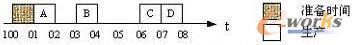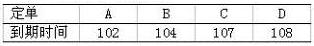 下面我們就來舉例說明。假定有4個定單需要在某個機床上排程,表1給出了定單交貨時間,優化的目標是使順序相關的生產準備時間總和最小。如果實際開始時間在100(時間單位),所有定單的加工時間相同(1個時間單位),順序相關的準備時間是0,1/3,2/3或1個時間單位(表2給出了準備時間矩陣)。那么,最優的排程顯然是ABCD(如圖5所示)。