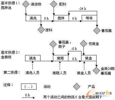 圖2給出了一個PPM的例子,它描述了一個特定尺寸和商標的瓶裝蕃茄醬的兩級生產流程。第一個PPM表達液體蕃茄醬的生產,包括清洗攪拌池,攪拌配料,和等待裝瓶。一旦蕃茄醬準備好了,它將在24小時內被裝瓶。蕃茄醬可同時用于不同尺寸的瓶子,每一種尺寸都將對應一個PPM。