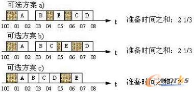 當重新執行排程優化時,我們可以得到一個新的包括定單E的可行排產方案,它減少了1/3的生產準備時間(如圖6所示)。