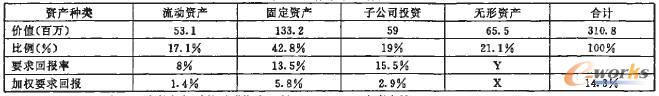 因為,企業的所有資金都會轉變為不同形式的資產形式,資產形式及其各自比例狀況(見表2)。以下四種形式:流動資產、固定資產、投資子公司、無形資產。本企業中除了無形資產外,每一種資產的要求回報率最化都比較容易。如流動資產和固定資產及子公司的“要求回報率”是各種資產的期望回報率。而動資產和固定資產的回報率與各自的期望周轉率有關,這里就不再贅述。子公司的要求回報率也可以通過期望盈利數額及期望投資數額的比例計算出。所以,表2中,“無形資產的要求回報率”設為“X”,“加權要求回報”設為“Y”。計算如下: