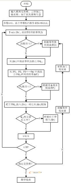 ⑥ 令t=t+1,若t小于N,則轉移到第③步;若t大于N,則計算排定的計劃是否滿足交貨期,若計劃超出交貨期,則調整零件優先級,更新加工優先級,重新進行排序,否則結束。