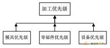 因此,除了以交貨期為優先規則的模具優先級外,還要給模具零件和設備設定優先級。零件優先級是根據實際情況和經驗人為設定的;設備優先級是為了均衡設備負荷,按任務最少選擇設備。將三者結合起來,一起構成工序的加工優先級,如圖2所示。