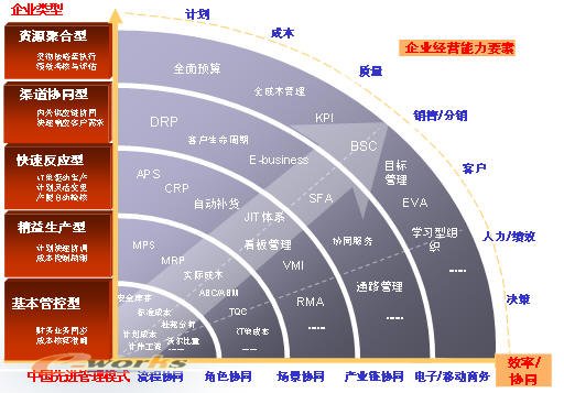 從競爭角度來看,中國企業可以分為五種競爭類型,即基本管控型、精益生產型、快速反應型、渠道協同型和資源聚合型。不同類型的企業對于先進管理模式的訴求,形成了逐步疊加的基本格局,而且又可以相互獨立部署。