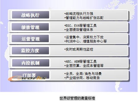 在全球化市場競爭中,能夠在細分市場或地區市場占有主導地位的企業,其所擁有的管理模式/方法/工具和經驗,就是世界級管理。中國企業管理在向世界級管理升級的過程中,必須了解世界級管理的衡量標準,通過對比,改進現有管理模型,加快中國企業向世界級管理邁進的步伐。不僅要研究和提煉這些企業的管理思想、模式和方法,更要共同實驗,把先進的信息技術結合到這些企業的經營與管理的創新活動中。