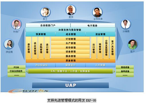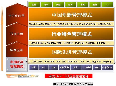 用友ERP從企業能力要素和企業競爭類型兩個緯度,針對不同類型不同能力要求的企業制定了不同的管理模式。每一種管理模式都是根據企業的競爭戰略和企業能力要素需求提出的,具有很強的針對性,對于企業中存在的管理問題對癥下藥,幫助企業提升管理能力和效率。用友ERP的實施過程就是幫助企業客戶有效地發掘和弘揚“價值鏈”、實現價值增值的過程。用友ERP的管理模式已經向行業應用和個性化應用發展,并提出了全面精細的產品結構。用友ERP的龐大用戶基礎和大量成功案例表明,用友將在中國模式連接世界級過程中發揮巨大作用。