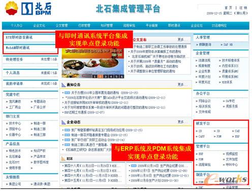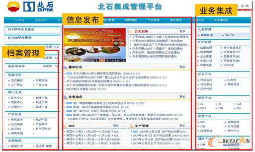 綜合集成:2009年北石廠已經建立起以協同辦公平臺為核心的集成管理平臺,它突破原OA系統的限制,將黨建專欄、產品信息、企業管理、公文發布、企業動態等信息平臺進行展示,將人事管理、生產管理、技術質量等業務平臺進行歸類,將辦公平臺、研發平臺、管理平臺、制造平臺等業務系統進行整合,使得北石集成管理平臺時充分具備信息發布、檔案管理、業務綜合集成強大功能。