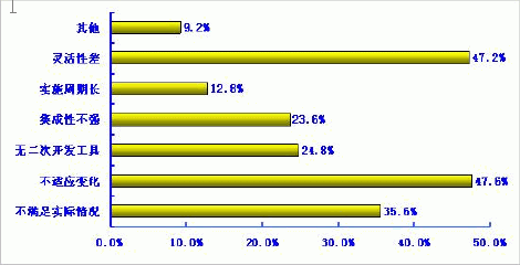 事實上,管理軟件第三次革命的發生是必然的,是用戶和管理軟件提供商共同作用的結果。記者從計世資訊(CCW Research)多年來的用戶滿意度研究中了解到,在2004年,用戶對管理軟件的滿意度并不高,只有7.37分(滿分10分)。更進一步,計世資訊(CCW Research)研究發現,用戶對現有應用軟件最不滿意的前三個因素分別是:不適應變化、靈活性差和不滿足企業實際情況。計世資訊(CCW Research)認為,出現這種情況是與中國信息化的基本情況息息相關的。中國信息化現狀的典型特征是,已建設的信息系統不是特別多,信息孤島問題也不是非常突出。他們現在面臨的信息化任務,更多地是迫于競爭的壓力,建設相應的IT系統來提升競爭力、規范管理、提高效率。他們對應用軟件有三個突出的要求:符合自己的需求、建設速度要快、能適應變化。從這三個問題可以現,管理軟件不能個性化地滿足自己的需求,是用戶心中最大的痛。