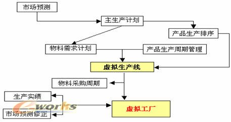 與ERP基本思路一致,首先基于預測產生主生產計劃,將主生產計劃進一步細化為生產順序,通過BOM產生物料需求計劃,然后設定產品生產周期管理數據庫,將兩者融合成為工廠的虛擬生產線,再結合物料采購周期數據庫、生產實績與市場預測的修正產生虛擬工廠的概念。這樣的好處在于: