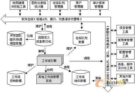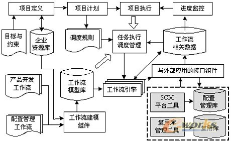 通過在項目管理數據庫的任務表中引入任務執行條件,在相應的工作流定義表及流程路由規則表中可建立對項目任務相關信息的參照關系;在工作流執行階段,通過跟蹤確認所定義的工作流中各任務的實際執行時間信息、所處狀態、執行異常情況等,可實現對項目進度的監控。另外,通過在工作表單(Form)模型中加入配置管理的需求信息、配置管理對象(如各類目標軟件制品)信息、相關的外部系統模塊及接口信息等,這樣,在相應的外部應用接口組件的支持下,可實現與配置管理平臺工具或復用庫管理工具的集成。而且,借助工作流管理系統,可改善現有配置管理平臺對流程管理能力的不足,真正實現基于流程的配置管理策略,能夠保證針對特定配置工作流只有特定人員才能訪問到特定資產。