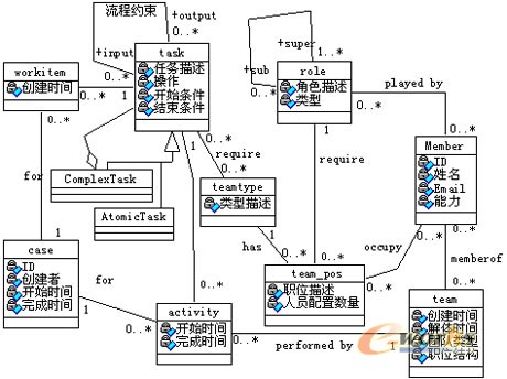 W.M.P.van der Aalst(2001)認為[1]:當前的工作流系統通常假定每個工作項(WorkItem)是由單個的執行者(Worker)完成的,故不能對團隊協同方式的工作項執行提供支持。文獻[2]對支持團隊開發的企業組織模型進行了研究,給出了包含組織縱向和橫向結構的組織元模型,通過將組織規則和組織結構的分離,實現在組織結構不變的情況下,通過修改組織規則以達到提高企業敏捷性的目的;文獻[3]針對工作流系統對動態團隊和不確定任務支持的要求,利用面向對象建模團隊的組織結構,采用OCL語言規范化描述團隊內部結構約束和團隊-任務約束,用來解決團隊對應的工作流任務不確定問題;Action Technologies公司提供的Action Workflow著重支持以員工和/或團隊間通信為主的過程[4];文獻[5]進一步對基于工作流的ERP系統開發與實施方法進行了研究。