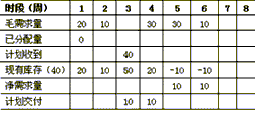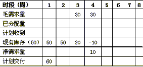 以上計算過程表明雖然1,2,4,6周均需要A,但實際A只要3及4周交付10個即可以了。這個計劃下達時間和數量就是部件B和C的毛需求的時間和數量。