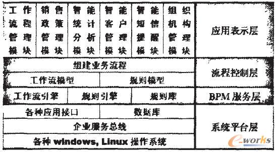 圖1為基于BPM的產品批發業務集成平臺架構圖,系統總體架構分為四層,各層詳細功能如圖l所示。