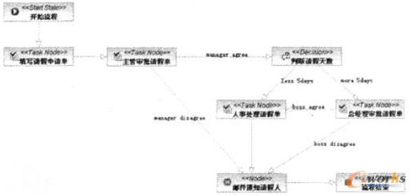 整個平臺使用JSP來實現系統頁面,業務流程管理引擎采用JBPM,數據庫存儲支持采用Hibernate實現。現以員工請假流程介紹實現過程。