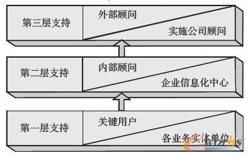 一般來說,ERP的運(yùn)維支持體系主要分為3個層次,即關(guān)鍵用戶、內(nèi)部顧問和外部顧問,如圖2所示。