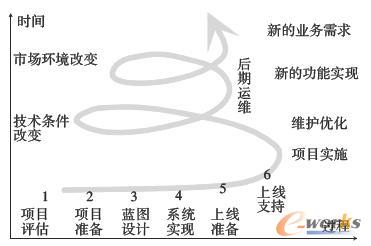 ERP項(xiàng)目是一個持續(xù)改善的過程,不管是系統(tǒng)實(shí)施還是系統(tǒng)保障,或者是系統(tǒng)優(yōu)化、系統(tǒng)擴(kuò)充,都必須通過項(xiàng)目評估、項(xiàng)目準(zhǔn)備、藍(lán)圖設(shè)計、系統(tǒng)實(shí)現(xiàn)、上線準(zhǔn)備、上線支持等6個步驟保障系統(tǒng)的穩(wěn)定,ERP項(xiàng)目持續(xù)改善過程如圖1所示。