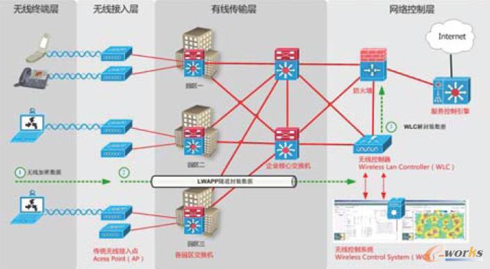 在網絡控制層中,該架構增加了無線控制器(Wireless LanController,下簡稱WLC)和無線控制系統(Wireless ControlSystem,下簡稱WCS)。WLC主要對AP進行統一集中管理,以實現網絡的安全性和管理的靈活性,是無線網絡統一架構的關鍵設備之一。WCS屬于配套管理系統,在該架構中可查看整個無線網絡覆蓋的信號強度和范圍,并能管理連接無線的用戶,查看其身份,IP地址和具體的位置等功能,為統一無線架構的更是增加了靈活方便的元素。