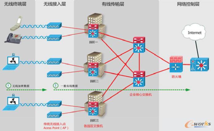 企業傳統無線網絡架構由四大板塊組成,分別是:無線終端層、無線接入層、有線傳輸層和網絡控制層。在該架構中,AP相互獨立部署于整個企業的園區內,用戶的無線數據終端可通過加密信道將數據發送至AP,由AP再將數據轉發至有線傳輸層,繼而訪問企業內部資源或是互聯網資源,詳情可參考圖一。