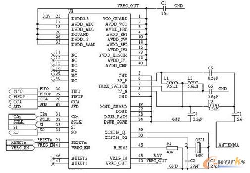 CC2430外圍電路如圖3所示。CC2430內(nèi)部使用1.8V工作電壓,適合于電池供電的設(shè)備,外部數(shù)字I/O接口使用3.3V電壓,這樣可以保持和 3.3V邏輯器件的兼容型。它在片上集成了一個(gè)自流穩(wěn)壓器,能夠把3.3V電壓轉(zhuǎn)化成1.8V電壓。這樣對于只有3.3 V電源的設(shè)備,不需要額外的電壓轉(zhuǎn)換電路就能正常工作。