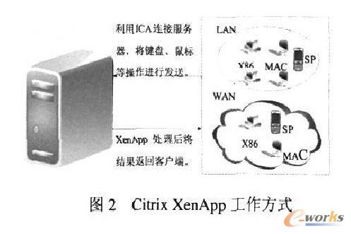 XenApp是一種按需應用交付的虛擬化軟件,能夠在數(shù)據(jù)中心對所有Windows應用實現(xiàn)虛擬化、集中部署和管理,并能作為一項服務、通過任何設備向所有用戶交付應用。客戶端只需要安裝ICA (Independent Computing Architecture)客戶端連接程序,就可以通過瀏覽器進行XenApp連接獲得應用;此外,XenAp還可通過互聯(lián)網(wǎng)進行安全連接,而且客戶端不儀可以是X86、MAC計算機,還可以是智能手機等終端設備。XenApp 工作方式如圖2所示。