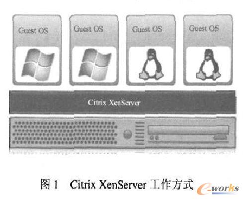 XenServer是由Citrix公司推出的基于Linux的服務器虛擬化和動態(tài)工作負載交付管理軟件產(chǎn)品,該軟件提升了服務器利用率,降低了成本,簡化了物理和虛擬環(huán)境中的服務器管理和應用部署。XenServer不需要在其他操作系統(tǒng)下運行,可直接作為系統(tǒng)安裝,它在硬件和虛擬操作系統(tǒng)之間提供了一個抽象層,讓每臺物理服務器都能運行一個或多個目前已知的絕大部分操作系統(tǒng),將操作系統(tǒng)及其應用從硬件中有效地分離出來(XenServer 工作方式如圖1所示)。XenServer需在客戶端利用XenCenter軟件來進行操作。